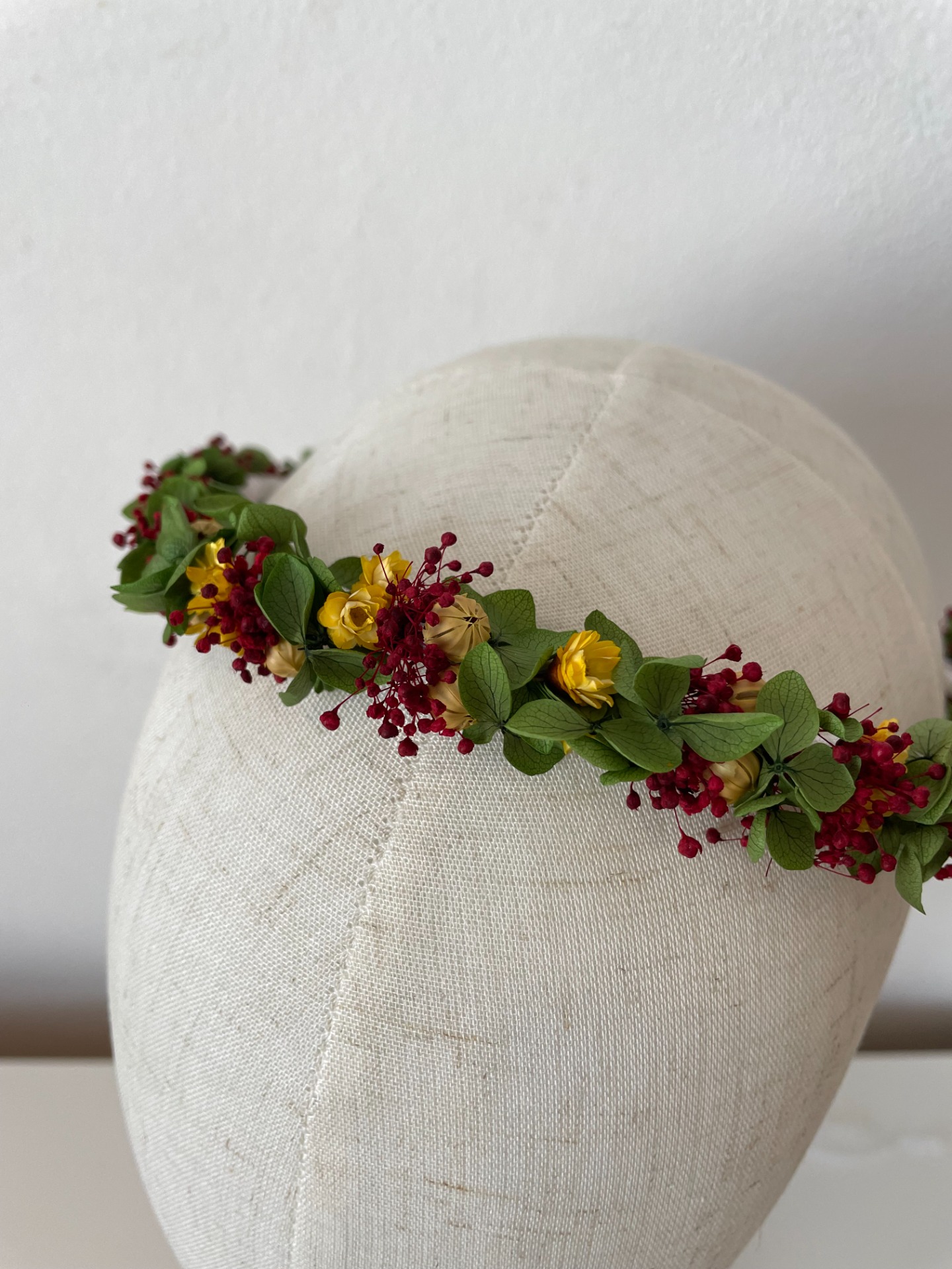 Jemný, romantický věneček s červenými a zelenými tóny, který podtrhne něžnost a slavnostní chvíle – ideální pro nevěsty, družičky i na focení při speciálních příležitostech.