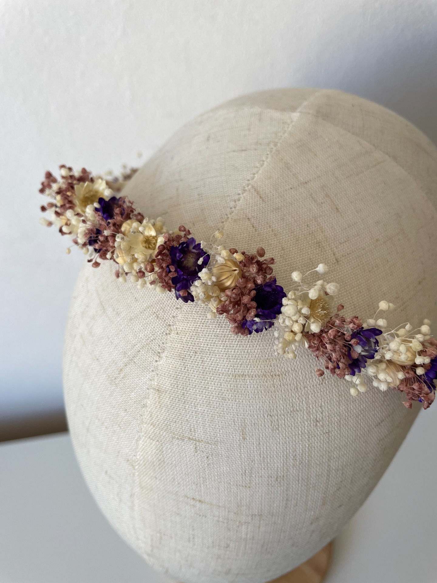 Jemný, romantický, věneček s fialovými tóny, který podtrhne něžnost a slavnostní chvíle – ideální pro nevěsty, družičky i na focení při speciálních příležitostech.