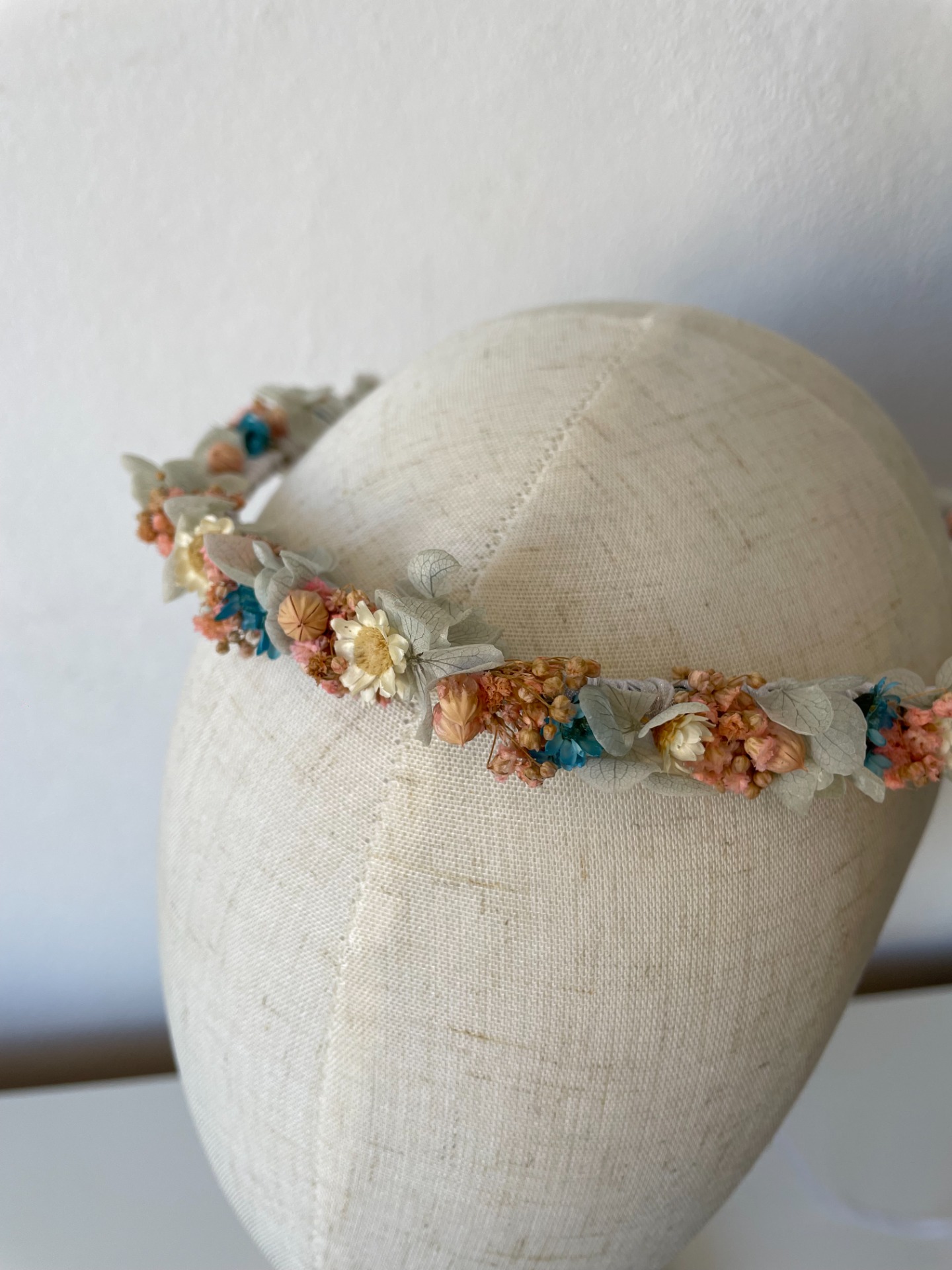 Jemný, romantický věneček s modrými a růžovými tóny, který podtrhne něžnost a slavnostní chvíle – ideální pro nevěsty, družičky i na focení při speciálních příležitostech.