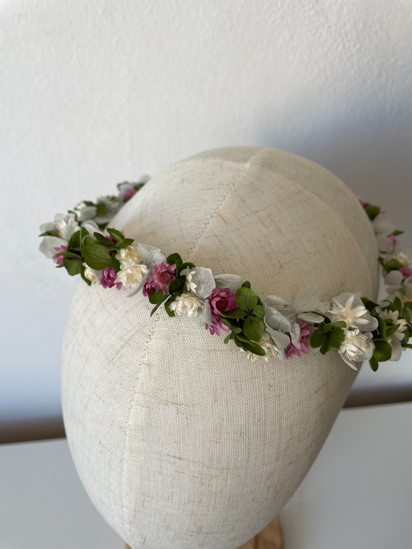 Jemný, romantický věneček s růžovými a zelenými tóny, který podtrhne něžnost a slavnostní chvíle – ideální pro nevěsty, družičky i na focení při speciálních příležitostech.
