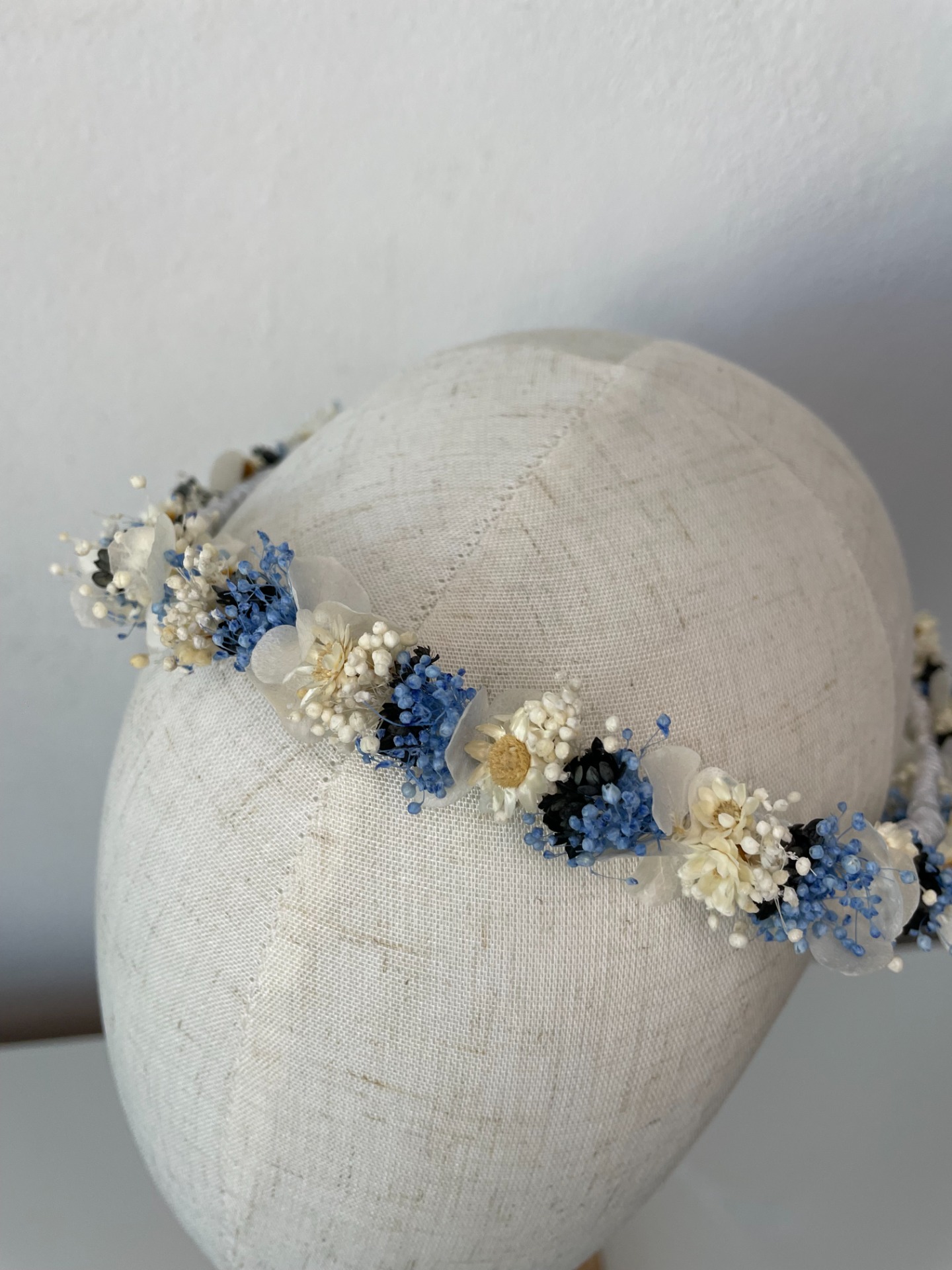 Jemný, romantický věneček s modrými a černými tóny, který podtrhne něžnost a slavnostní chvíle – ideální pro nevěsty, družičky i na focení při speciálních příležitostech.