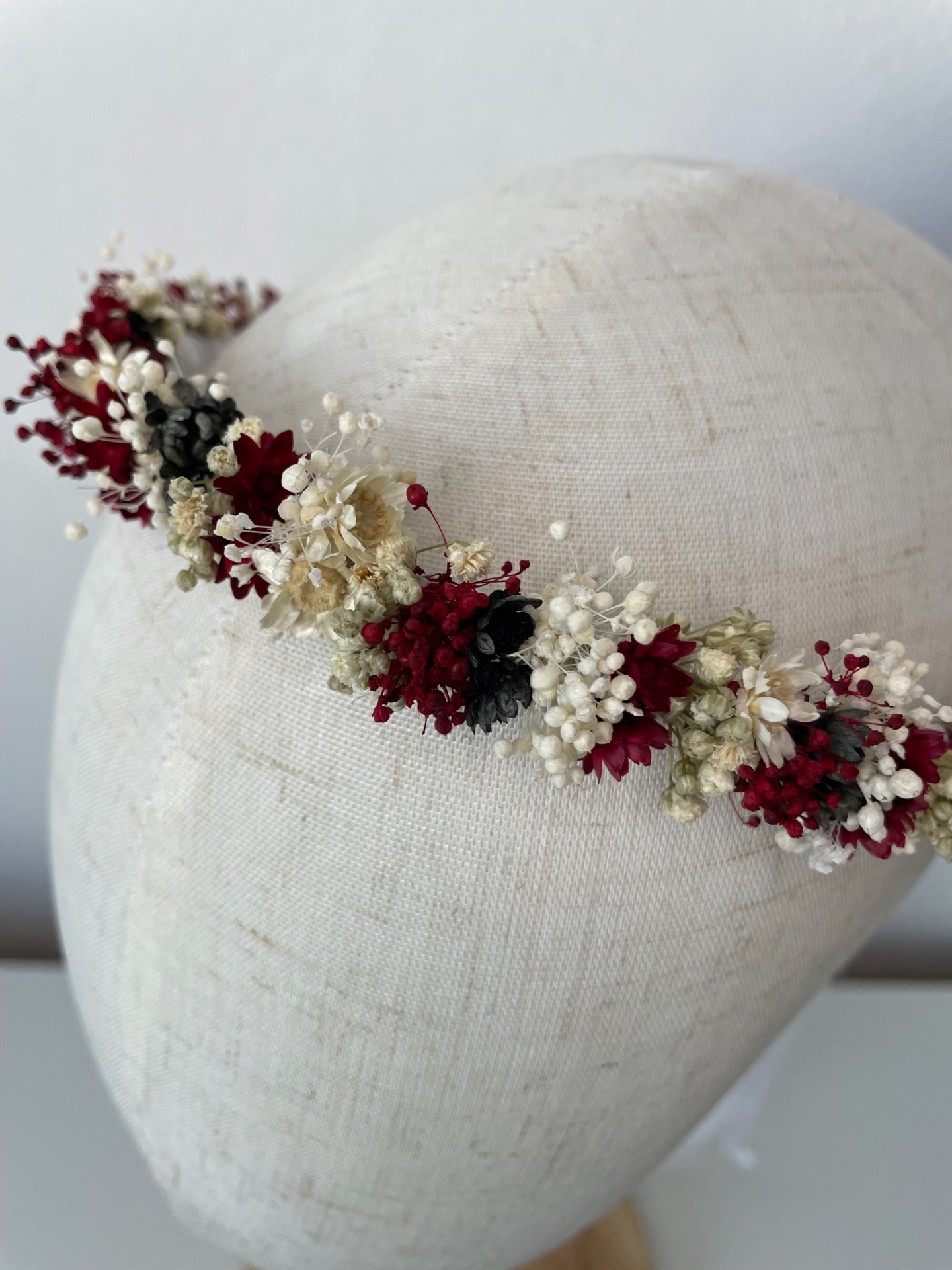 Jemný, romantický věneček s červenými a černými tóny, který podtrhne něžnost a slavnostní chvíle – ideální pro nevěsty, družičky i na focení při speciálních příležitostech.