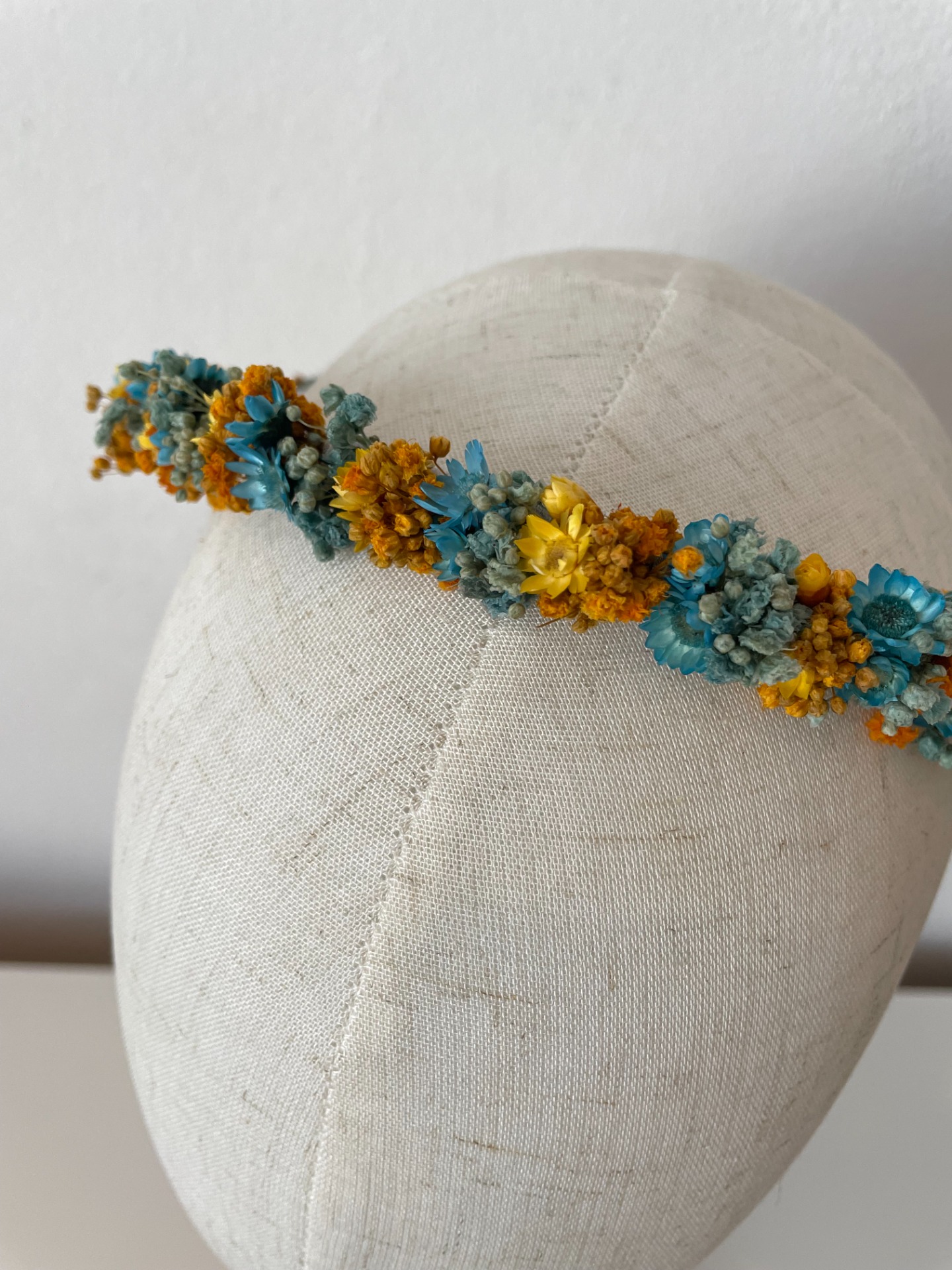 Jemný, romantický věneček s modrými a žlutými tóny, který podtrhne něžnost a slavnostní chvíle – ideální pro nevěsty, družičky i na focení při speciálních příležitostech.