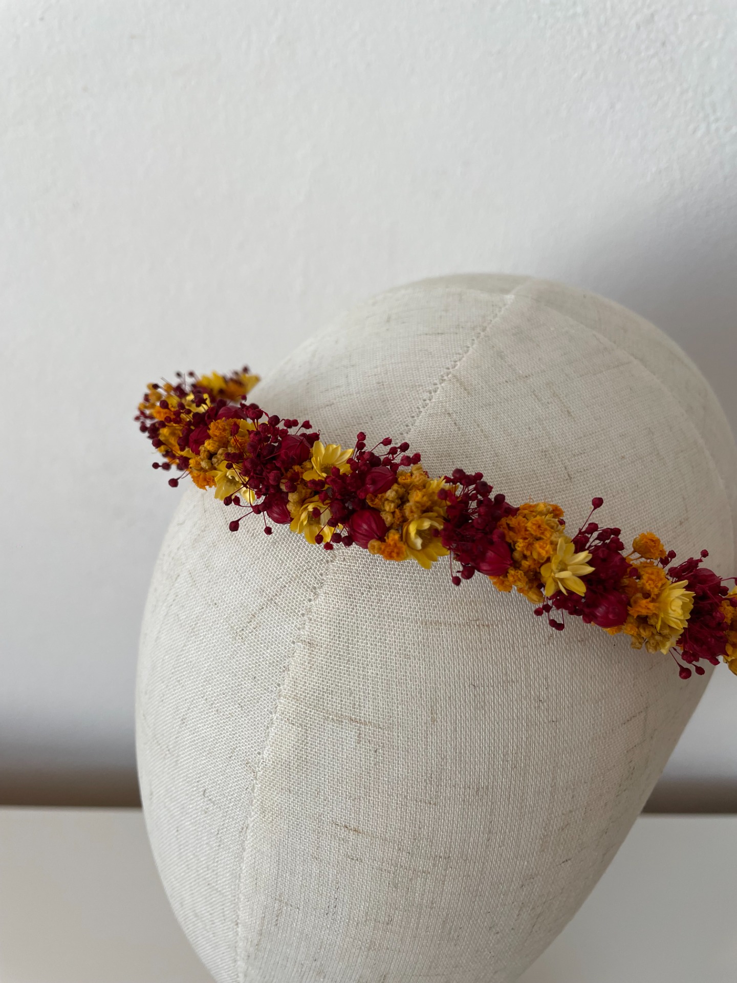 Jemný, romantický věneček s červenými a žlutými tóny, který podtrhne něžnost a slavnostní chvíle – ideální pro nevěsty, družičky i na focení při speciálních příležitostech.
