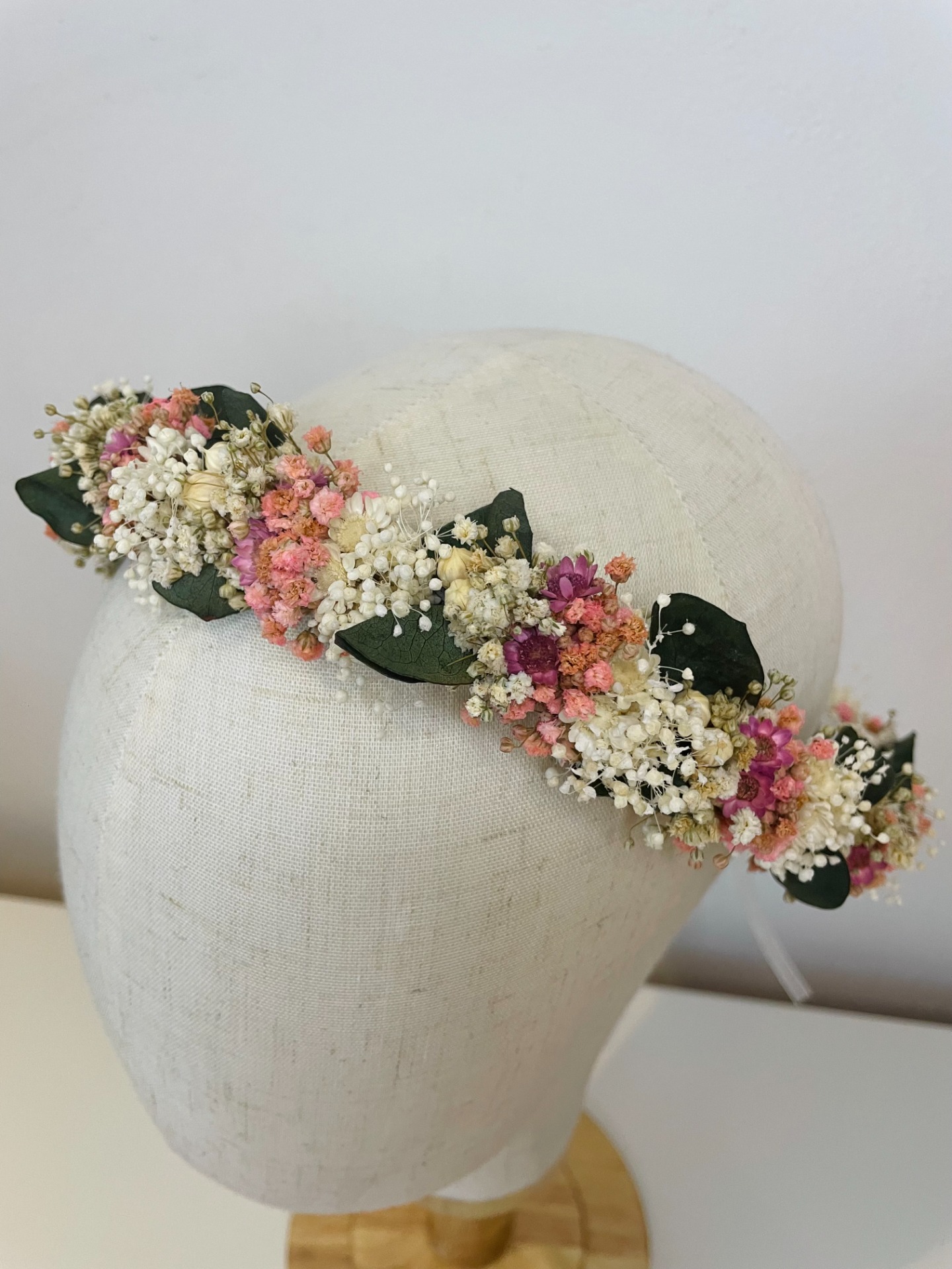 Jemný, romantický, věneček s růžovými tóny, který podtrhne něžnost a slavnostní chvíle – ideální pro nevěsty, družičky i na focení při speciálních příležitostech.