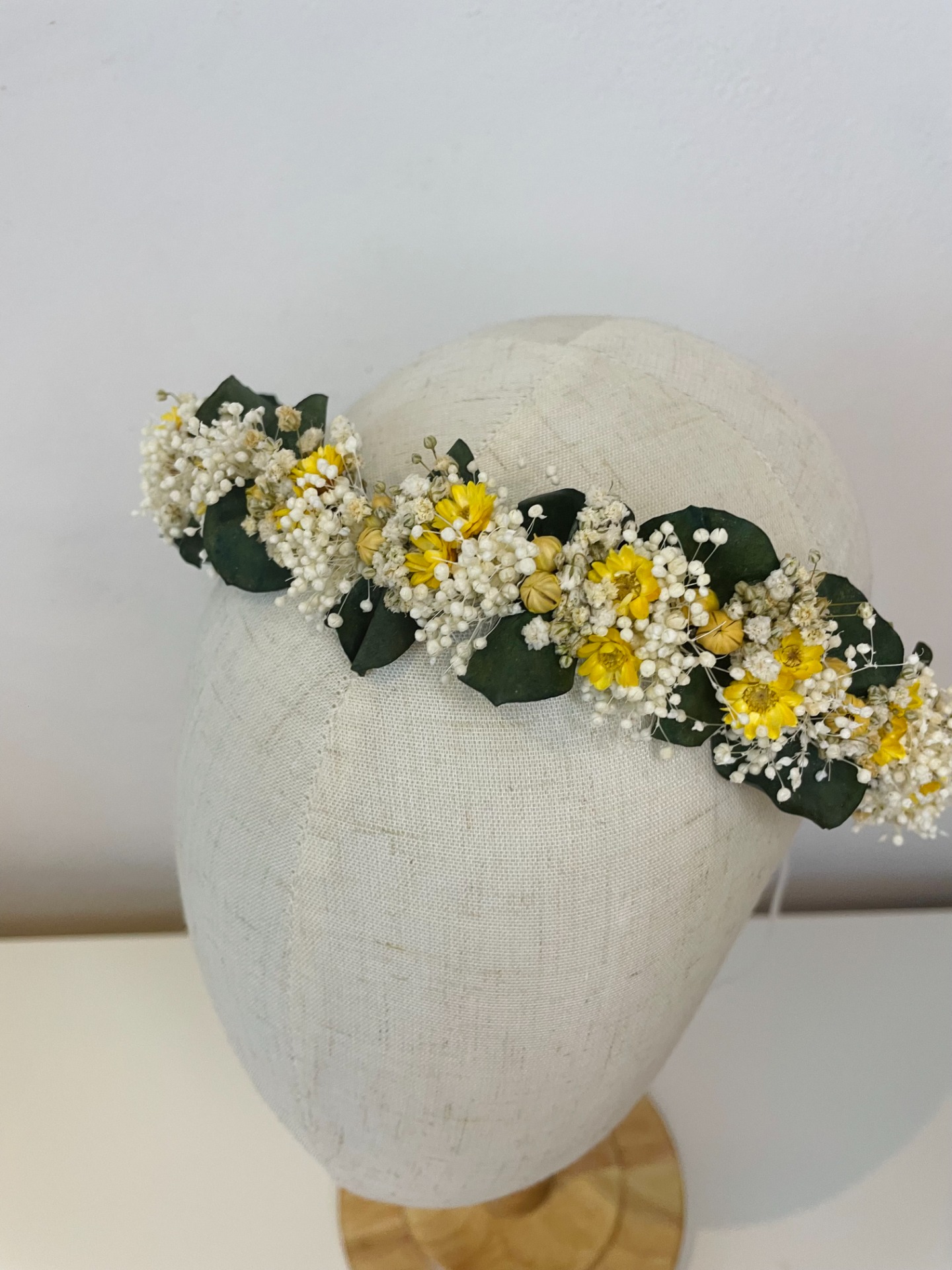 Jemný, romantický, věneček se žlutými tóny, který podtrhne něžnost a slavnostní chvíle – ideální pro nevěsty, družičky i na focení při speciálních příležitostech.
