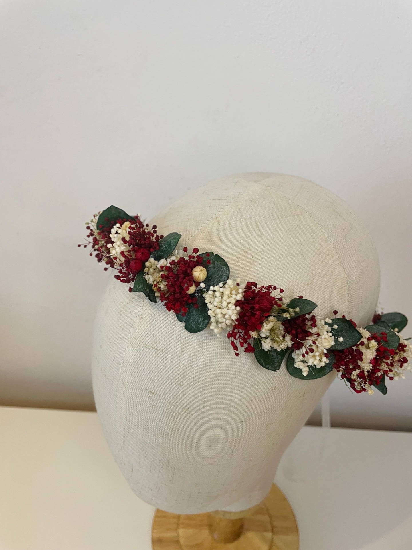 Jemný, romantický, věneček s červenými tóny, který podtrhne něžnost a slavnostní chvíle – ideální pro nevěsty, družičky i na focení při speciálních příležitostech.